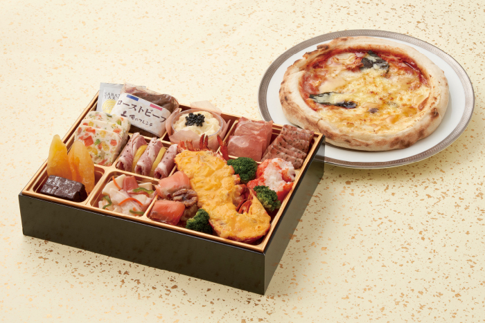 オマール海老の身にウニソースを絡めた「オマール海老のウニソース焼き」やローストビーフなど高級食材をご用意した贅沢おせちです。さらに、23cmピッツァ(マルゲリータ&クワトロフォルマッジのハーフ&ハーフ)がセットに!カジュアルにお楽しみいただけます。