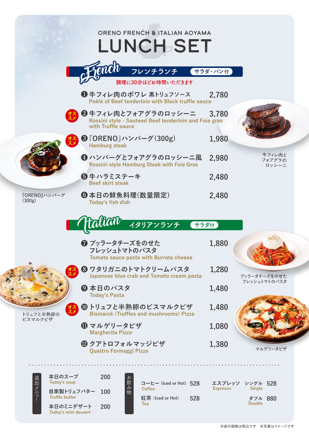 | 演奏時間 | 当店では、BGMの生演奏を行います。(各40分) ■平日 ①18:00~18:40 ②19:00~19:40 ③20:00~20:40 ■土・日・祝日 ①12:00~12:40 ②13:00~13:40 ③14:00~14:40 ④18:00~18:40 ⑤19:00~19:40 ⑥20:00~20:40 |